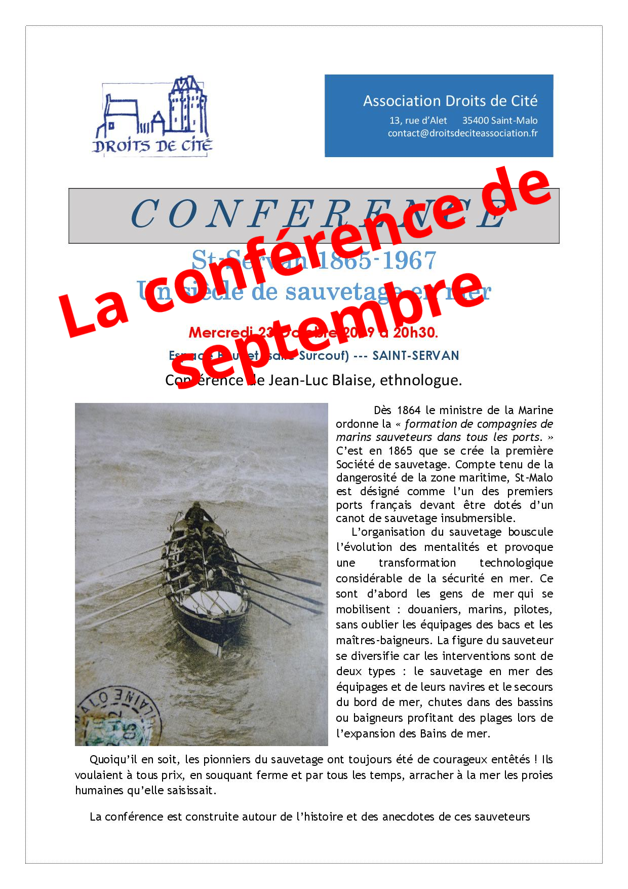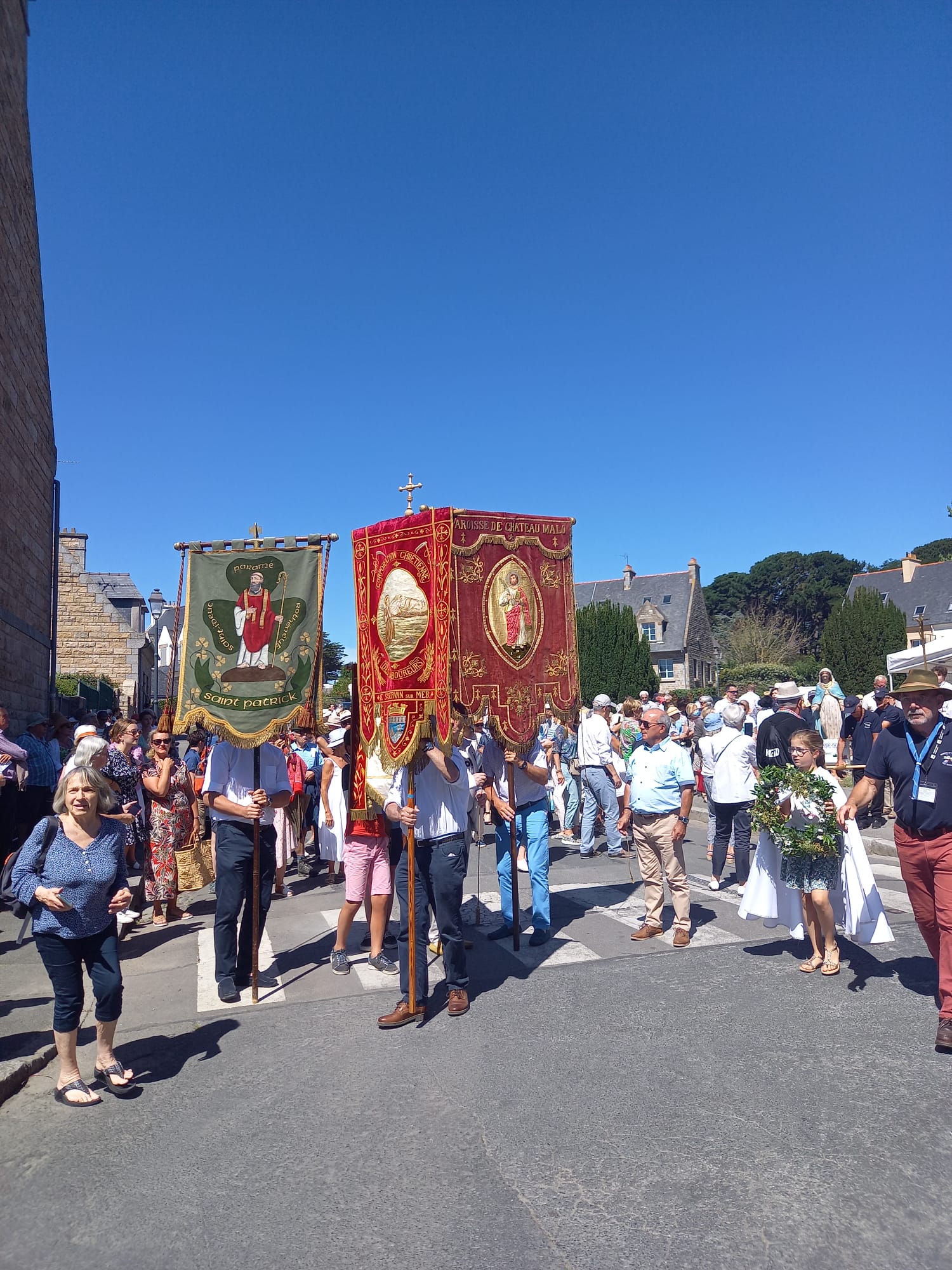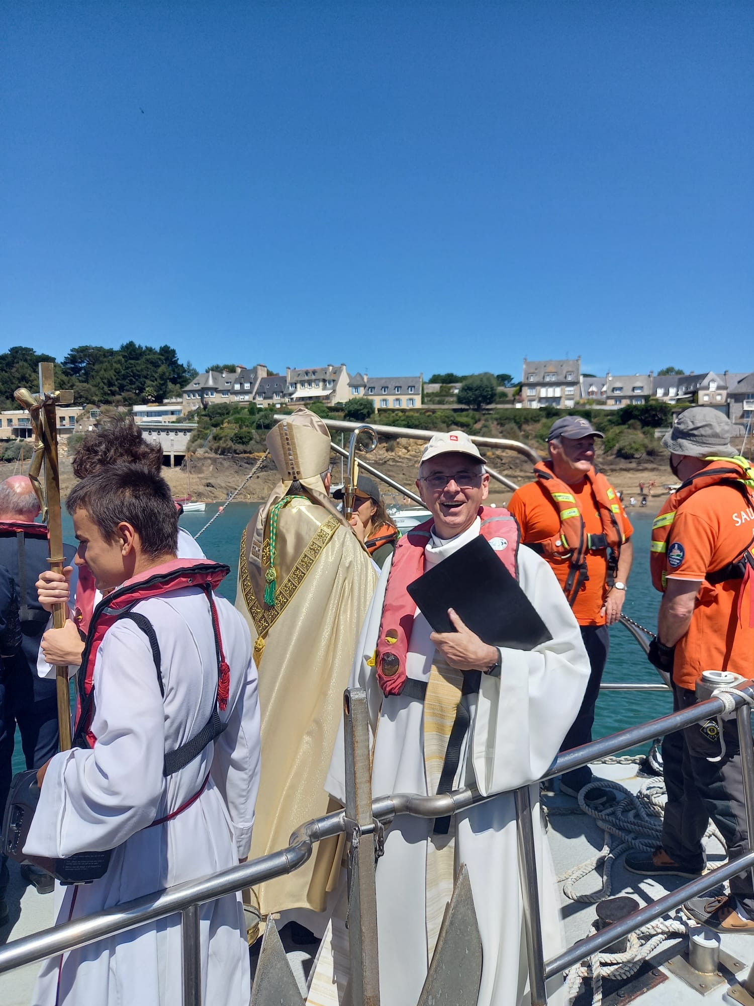 Ah mon Dieu, il y en eut des réunions pour ce pardon de la mer mais cela en valait la peine car le succès fut réel. Organisé par le père Hervé HUET et Joël LABLANCHE, sans oublier « Droits de Cité » qui y participa activement sur 2 fronts , l’organisation de la circulation et le plaisir de bouche avec les rois de la frite Christian et Maryvonne ORANGE toujours dévoués, toujours présents, venus exprès de leur Normandie à la demande de notre président Pierre LELIEVRE. La messe, présidée par Monseigneur JOLY évêque de Troyes, mais originaire de Saint-Servan fut très suivie par les servannais, les paroissiens des alentours mais aussi des touristes de passage et même par une famille d’ukrainiens orthodoxes ne parlant pas un mot de français mais leur portable pour traduire était là et le clergé par deux fois les salua gentiment. Puis la procession, derrière quatre bannières superbes dans le soleil et une jeune pucelle porteuse du bouquet se rendit au pied de la tour Solidor bénir les bateaux de tout genre venus cette année nombreux, très nombreux, assister à ce pardon de la mer. Ensuite le clergé et les personnalités embarquèrent pour déposer la gerbe de fleurs non pas au pied de la vierge de Bizeux mais cette année en direction de Cézembre. Puis la fête se poursuivit sur l’esplanade de la Tour Solidor ou après quelques mots de notre maire Gilles LURTON et pour mémoire l’historique du pardon de la mer présnt par le Dr Gilles FOUCRON et Pierre-Jean YVON, place aux chants de marins et repas joyeux bien de chez nous. On nous rapporta qu’il y eu 540 communions, qu’à la fin de la cérémonie, panique, l’encensoir avait disparu mais les anges veillaient, une bonne âme croyant bien faire l’avait ramené au presbytère ou le responsable put enfin pousser ouh! Céleste, mais enfin beaucoup plus grave et je vous jure que c’est vrai la crosse de l’évêque a été volée dans le train du retour, hé oui un malveillant lui ayant dérobé sa valise. Alors ici espérons vraiment un miracle et une suite heureuse.